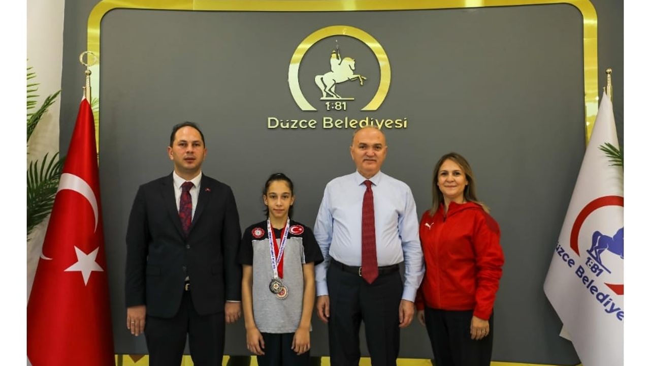 Yıldızlar Balkan Şampiyonası’nda bronz madalya kazanarak Türkiye’ye gurur yaşatan genç judocu Erva Eren, Düzce Belediye Başkanı Dr. Faruk Özlü tarafından makamında ağırlandı. Ziyarette, Gençlik ve Spor Hizmetleri Müdürü Cihan Ünal ile antrenör Nermin Alayıldız da yer aldı. Başkan Özlü, Düzce’yi ulusal ve uluslararası arenada başarıyla temsil eden genç sporcuyu tebrik ederek, “Spor şehri Düzce için çalışmaya devam edeceğiz” dedi.