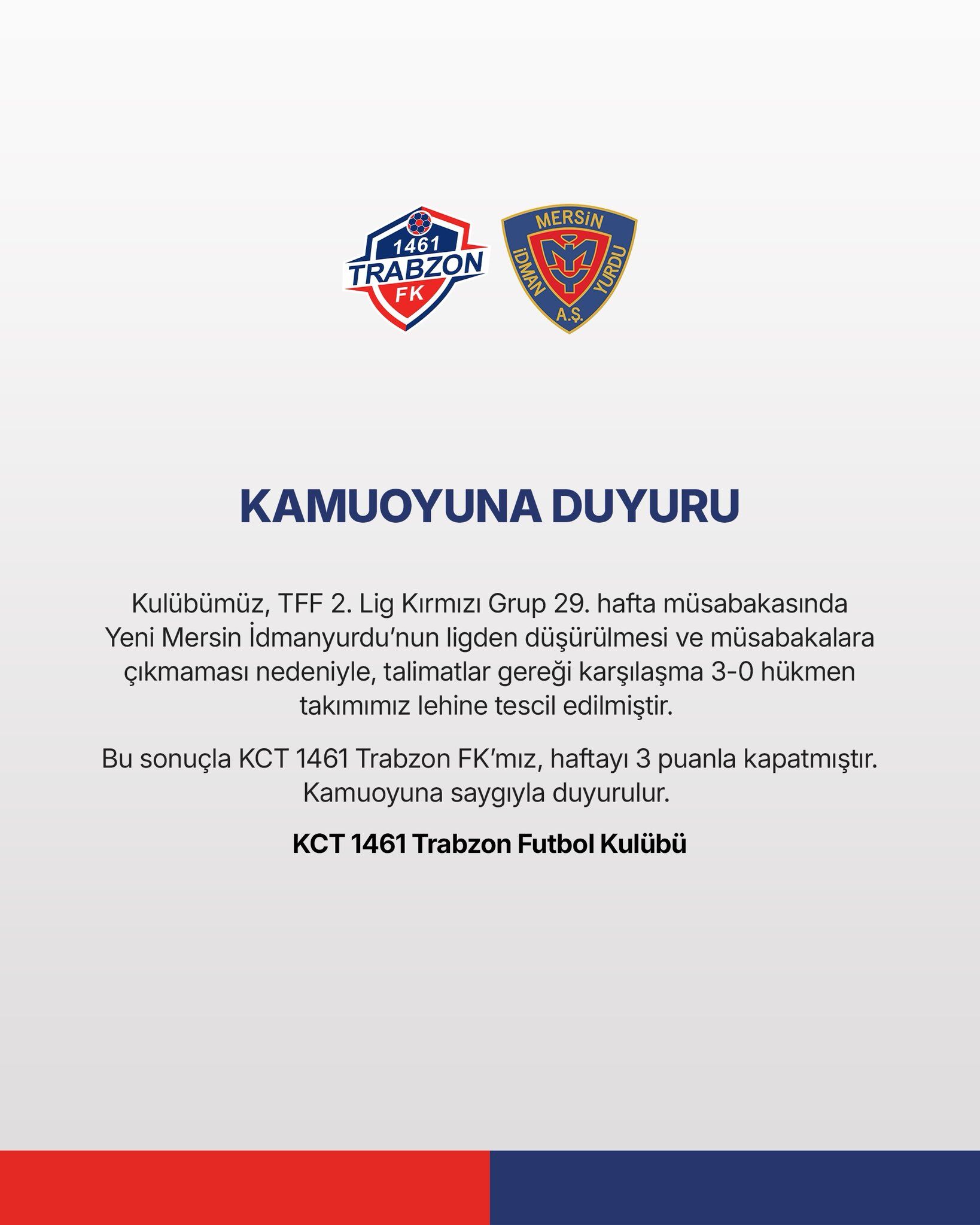Kulüpten yapılan “Kamuoyuna Duyuru” başlıklı açıklamada, “Kulübümüz, TFF 2. Lig Kırmızı Grup 29. hafta müsabakasında Yeni Mersin İY’nin ligden düşürülmesi ve müsabakalara çıkmaması nedeniyle, talimatlar gereği karşılaşma 3-0 hükmen takımımız lehine tescil edilmiştir” ifadelerine yer verildi. Açıklamanın devamında, “Bu sonuçla KCT 1461 Trabzon FK’mız, haftayı 3 puanla kapatmıştır. Kamuoyuna saygıyla duyurulur” denildi. Bu sonuçla birlikte 1461 Trabzon FK, ligdeki puan durumunda kritik bir avantaj elde etti. Hükmen galibiyet, takımın moral ve motivasyonunu da olumlu yönde etkiledi. Teknik ekip ve futbolcular, önümüzdeki haftalardaki maçlara odaklanmaya devam ediyor.