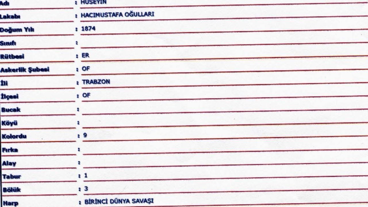 Ortahisar Belediyesi Başkan Yardımcısı Cüneyt Zorlu, büyükdedesi Mehmet oğlu Hüseyin’in yaşamını ve Sarıkamış’taki fedakârlığını paylaştı. 1874 doğumlu Hüseyin, Birinci Dünya Savaşı sırasında Kavarbat Muharebesi’nde şehit düşerek yedi yetim çocuk bıraktı. Bu belge sadece bir asker kaydı değil, bir ailenin ve kuşaklar boyu taşınan acının sessiz tanığı olarak önem taşıyor.