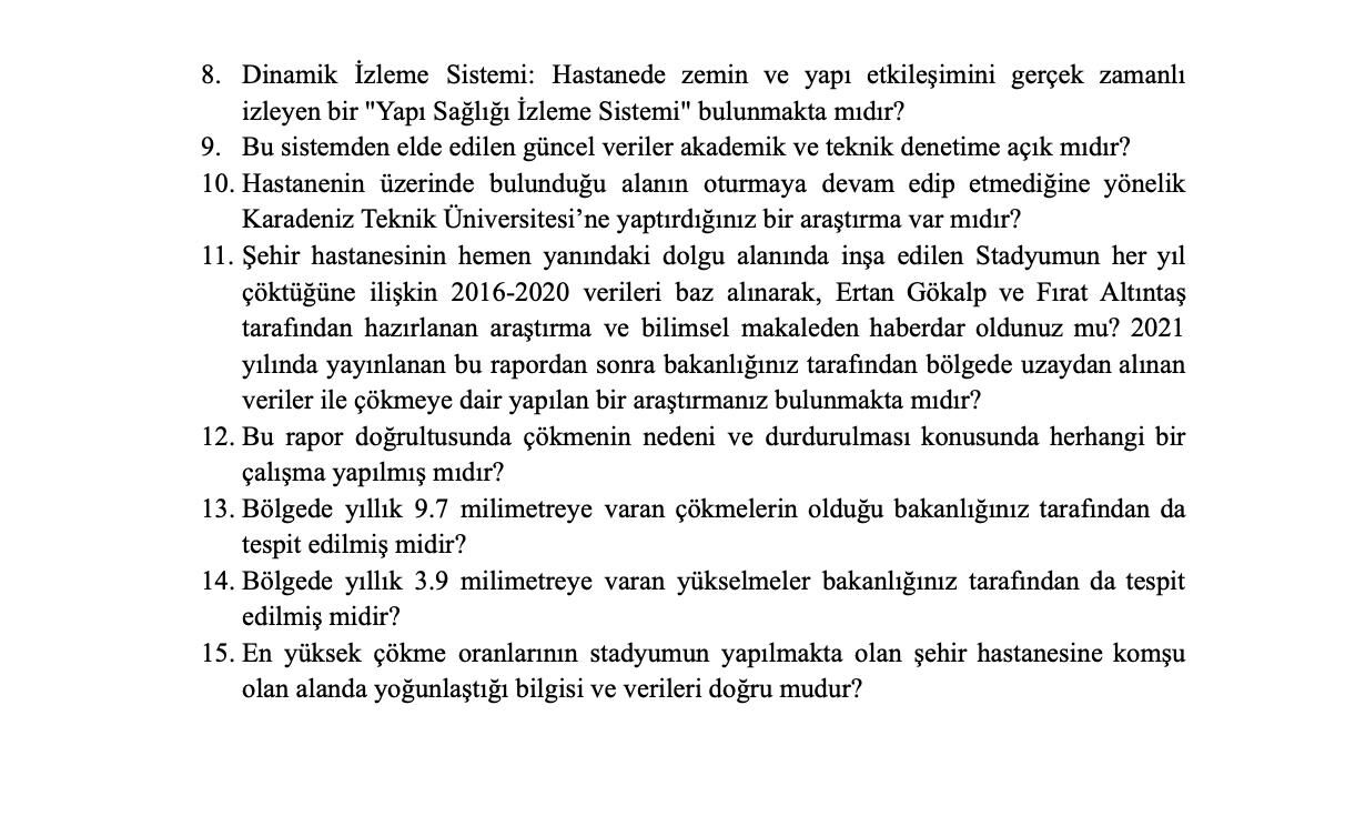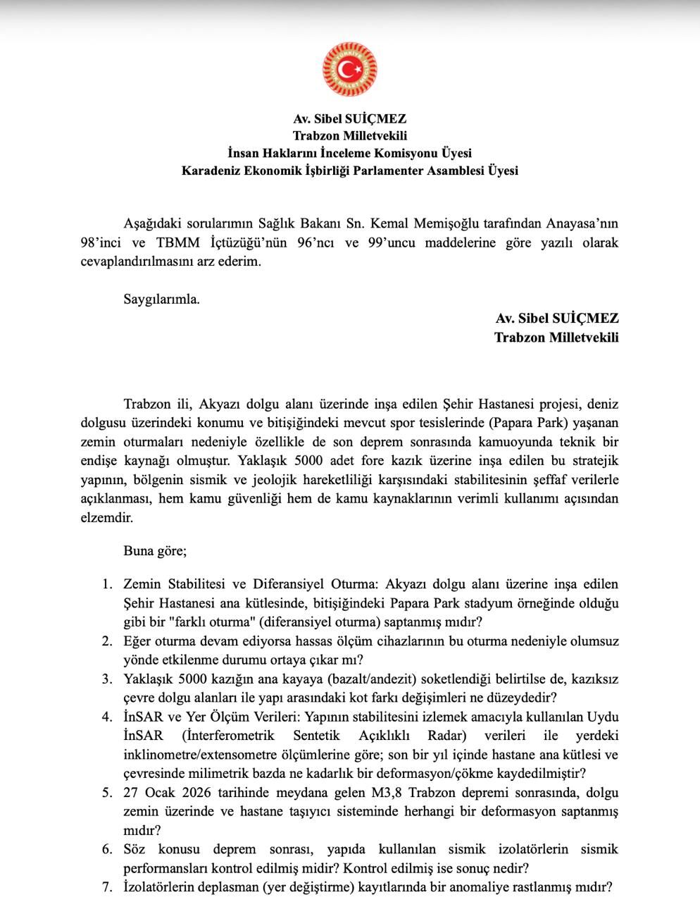 Milletvekili Sibel Suiçmez önergesinde, Trabzon Şehir Hastanesi inşaat sahasının jeolojik hareketlilik bölgesinde yer aldığını vurguladı. Bölgede deprem sonrası yıllık 9.7 milimetreye varan çökmeler ve 3.9 milimetreye ulaşan yükselmelerin tespit edildiğini hatırlattı. Bu verilerin dolgu alanlarının doğasından kaynaklandığını belirten Suiçmez, proje sahasında son bir yıl içinde ana kütle ve çevresinde milimetrik bazda ne kadar deformasyon yaşandığını sordu. Ayrıca dolgu ile yapı arasındaki kot farkı değişimlerinin hangi düzeyde olduğunu öğrenmek istedi. Bu sorular, Trabzon Şehir Hastanesi gibi dev bir projenin zemin güvenliği açısından ne kadar sağlam temellere oturduğunu merak ettiriyor.