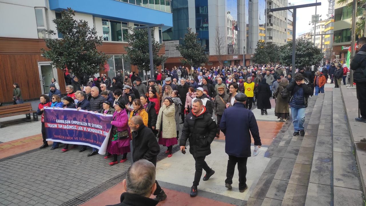 Trabzon’da düzenlenen yürüyüşte katılımcılar ABD ve İsrail’in İran’a yönelik saldırılarını protesto etti. Kahramanmaraş Caddesi’ndeki Koton mağazası önünde toplanan grup, pankartlar ve sloganlarla Meydan Parkı’na yürüdü. Yürüyüşe farklı sivil toplum temsilcileri, siyasi parti üyeleri ve vatandaşlar katıldı.