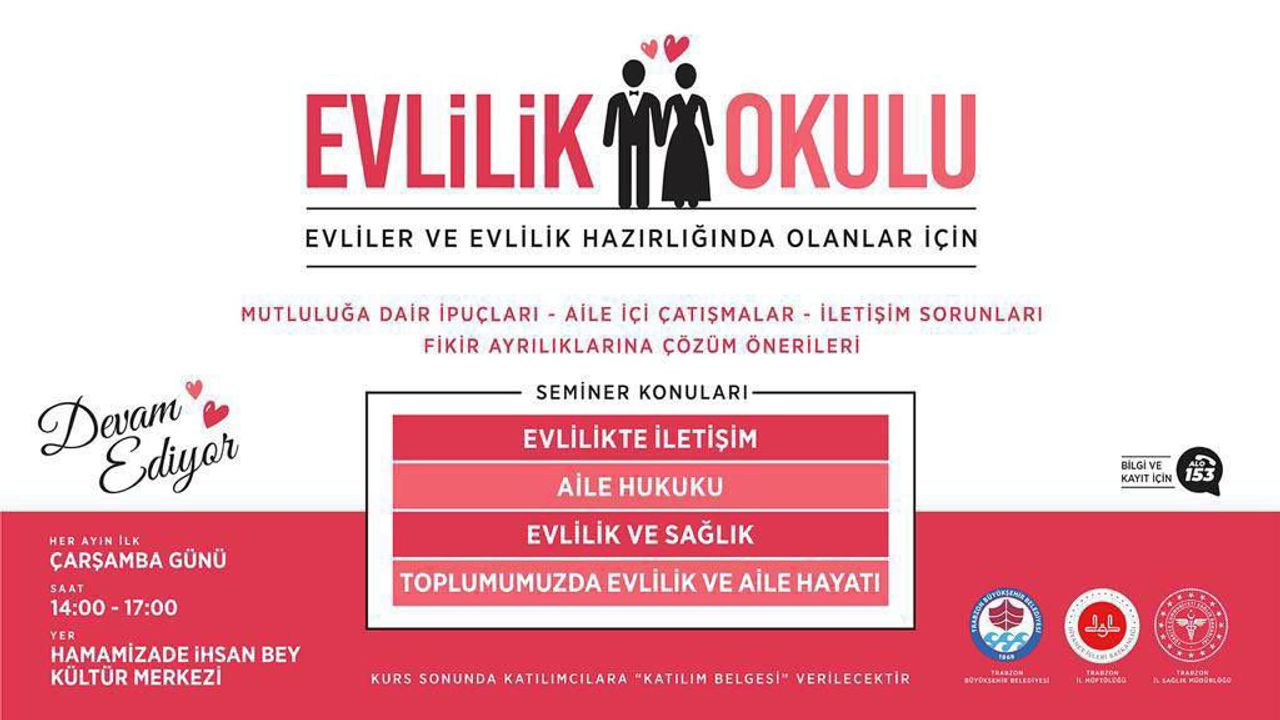 Aile içi huzuru desteklemeyi amaçlayan Evlilik Okulu seminerine tüm Trabzonlular davetli.