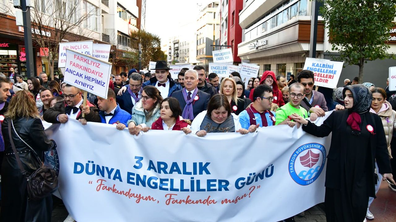 Trabzon’da 3 Aralık Dünya Engelliler Günü nedeniyle düzenlenen farkındalık programı geniş katılımla gerçekleştirildi. Trabzon Valiliği, Büyükşehir Belediyesi ve engelli derneklerinin iş birliğiyle düzenlenen etkinlikte, “Farkındayım, Farkında mısın?” mottosu öne çıktı. Vali Aziz Yıldırım başta olmak üzere birçok protokol üyesinin katıldığı programda kortej yürüyüşü, sergi ziyaretleri ve özel gösteriler yer aldı. Engelli bireylerin toplumsal yaşama eşit katılımının önemine vurgu yapıldı.