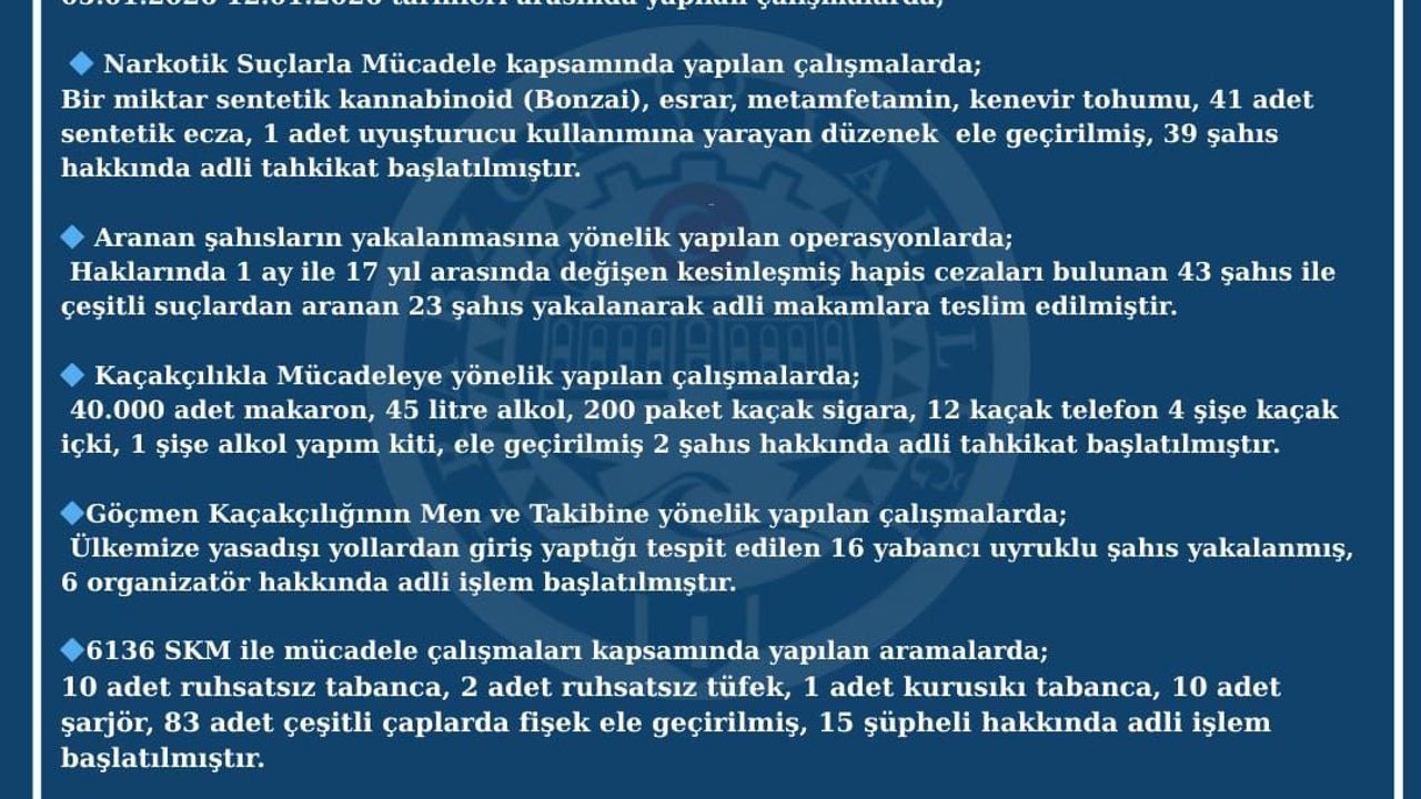 Trabzon Valiliği, il genelinde halkın huzur ve güvenliğinin sağlanması amacıyla yürütülen haftalık asayiş çalışmalarının sonuçlarını kamuoyuyla paylaştı. Valiliğe bağlı güvenlik birimlerince 05.01.2026 ile 12.01.2026 tarihleri arasında gerçekleştirilen denetim ve operasyonlarda, yasaklı madde ticareti ve kullanımıyla mücadeleden kaçakçılığa, aranan şahısların yakalanmasından göçmen kaçakçılığına kadar birçok alanda önemli başarılar elde edildi. Yapılan çalışmalar kapsamında çok sayıda suç unsuru ele geçirilirken, haklarında kesinleşmiş hapis cezası bulunan şahıslar da adli makamlara teslim edildi.