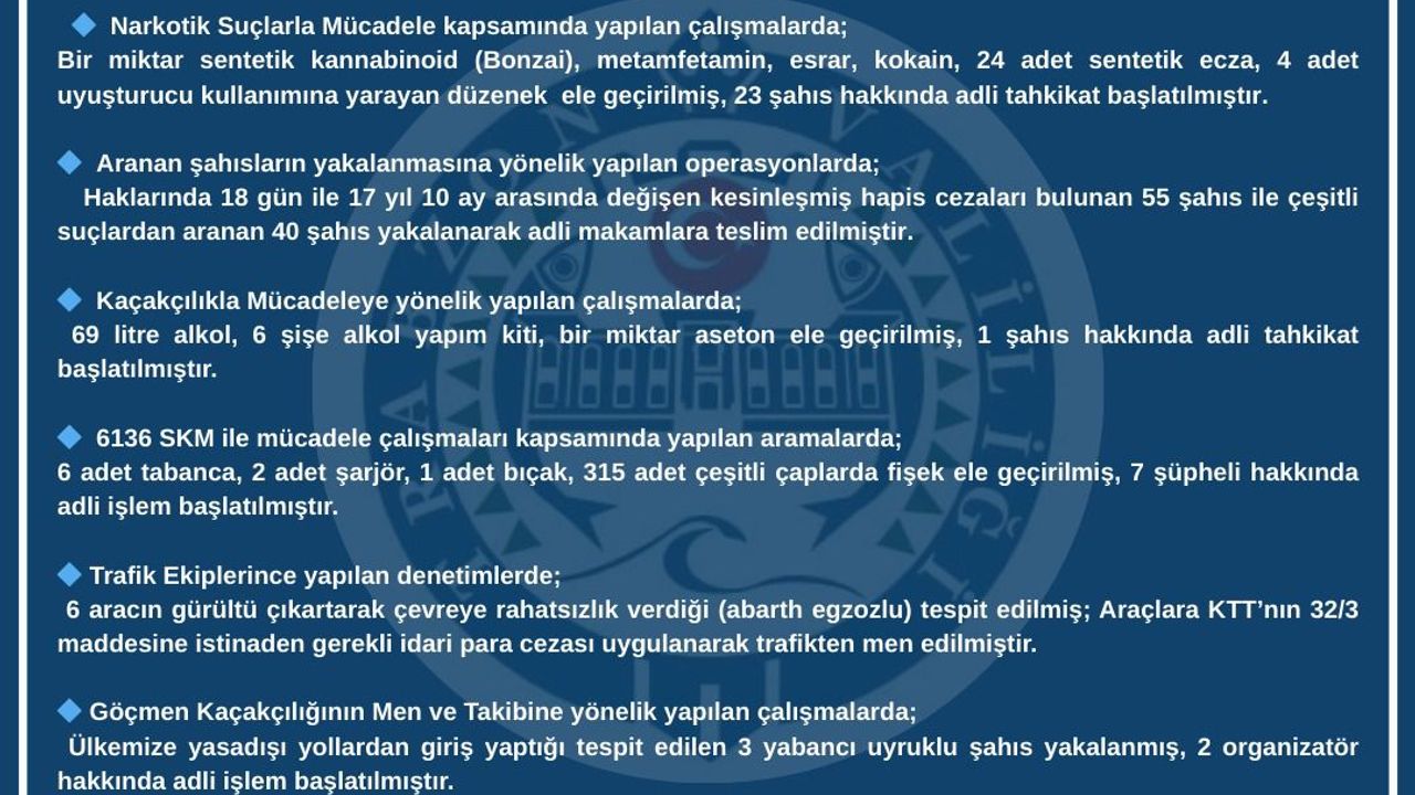 Aranan şahısların yakalanmasına yönelik yapılan çalışmalarda önemli sonuçlar elde edildi. Haklarında 18 gün ile 17 yıl 10 ay arasında değişen kesinleşmiş hapis cezaları bulunan 55 şahıs yakalanırken, çeşitli suçlardan aranan 40 şahıs da güvenlik güçlerince gözaltına alındı. Yakalanan toplam 95 şahıs, işlemlerinin ardından adli makamlara teslim edildi.