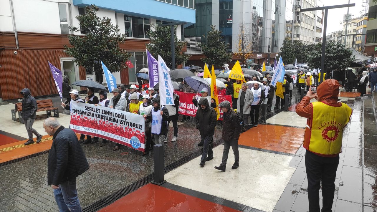 Trabzon’da Kamu Emekçileri Sendikaları Konfederasyonu (KESK) bileşenleri, ekonomik krizin derinleşmesi ve alım gücünün düşmesine karşı üretimden gelen güçlerini kullanarak iş bırakma eylemi gerçekleştirdi. Kahramanmaraş Caddesi’nde bir araya gelen yüzlerce kamu çalışanı, sağanak yağışa aldırış etmeden sloganlar eşliğinde Atatürk Alanı’na kadar yürüdü. Eyleme katılan memurlar, emekliler ve işçiler; hazırlanan 2026 yılı bütçesinin halkın değil, sermayenin bütçesi olduğunu savunarak taleplerini gür bir sesle dile getirdi.