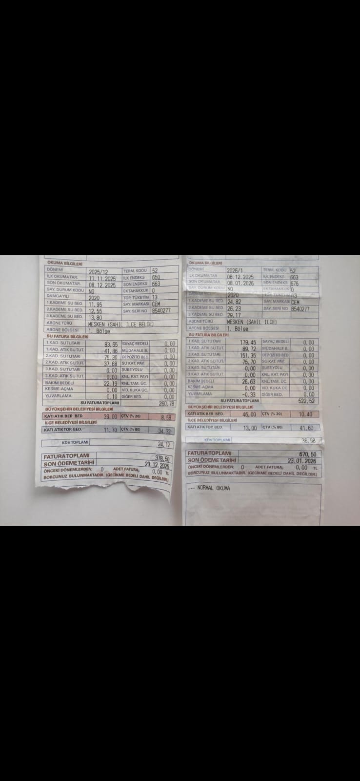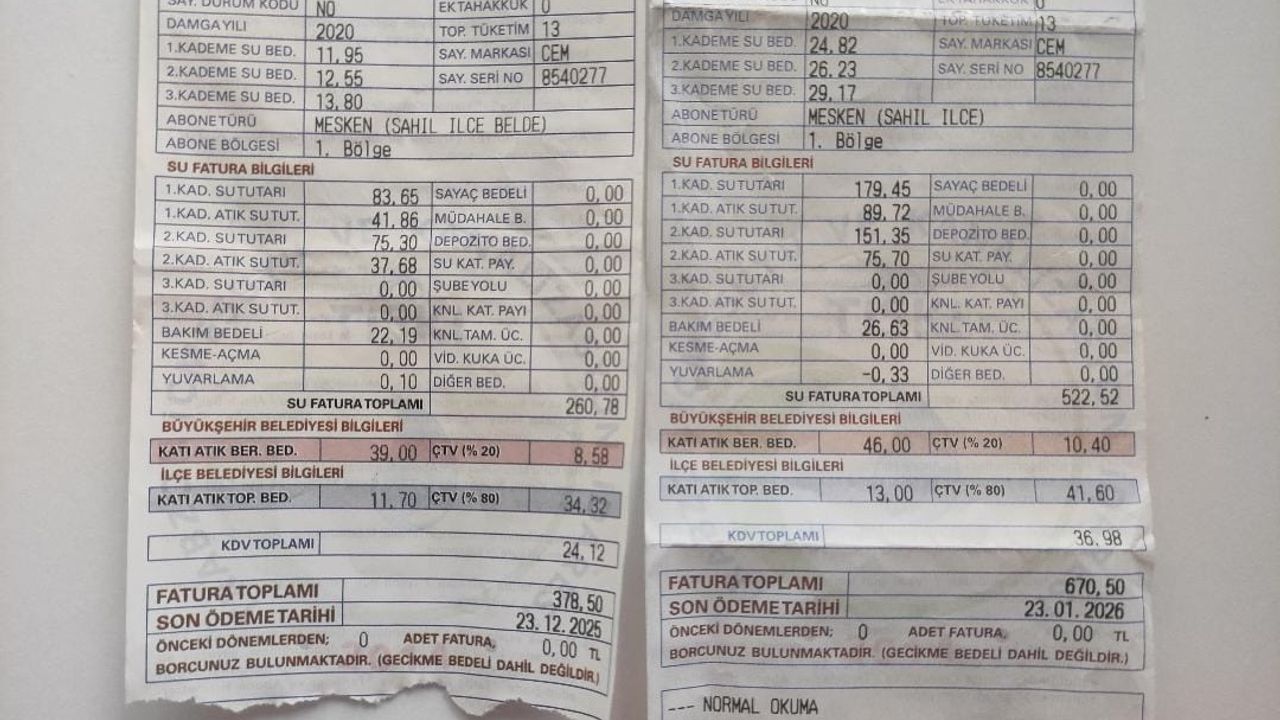 Trabzon’da su tüketim alışkanlığı değişmeyen ancak faturası katlanan abonelerin sayısı her geçen gün artıyor. Somut bir örnekle durumun vehameti ortaya konuldu: Aralık ayında 13 ton su tüketen bir abonenin faturası 378 TL olarak belirlenirken, Ocak ayında yine aynı miktarda, yani 13 ton tüketim yapan aynı aboneye tam 670 TL fatura gönderildi. Aradaki yaklaşık 300 liralık fark, su birim fiyatlarına ve ek bedellere yapılan gizli veya açık zamların boyutunu kanıtlar nitelikte. Vatandaşlar, metreküp fiyatlarının hangi kriterlere göre bu denli yükseltildiğini merak ediyor.