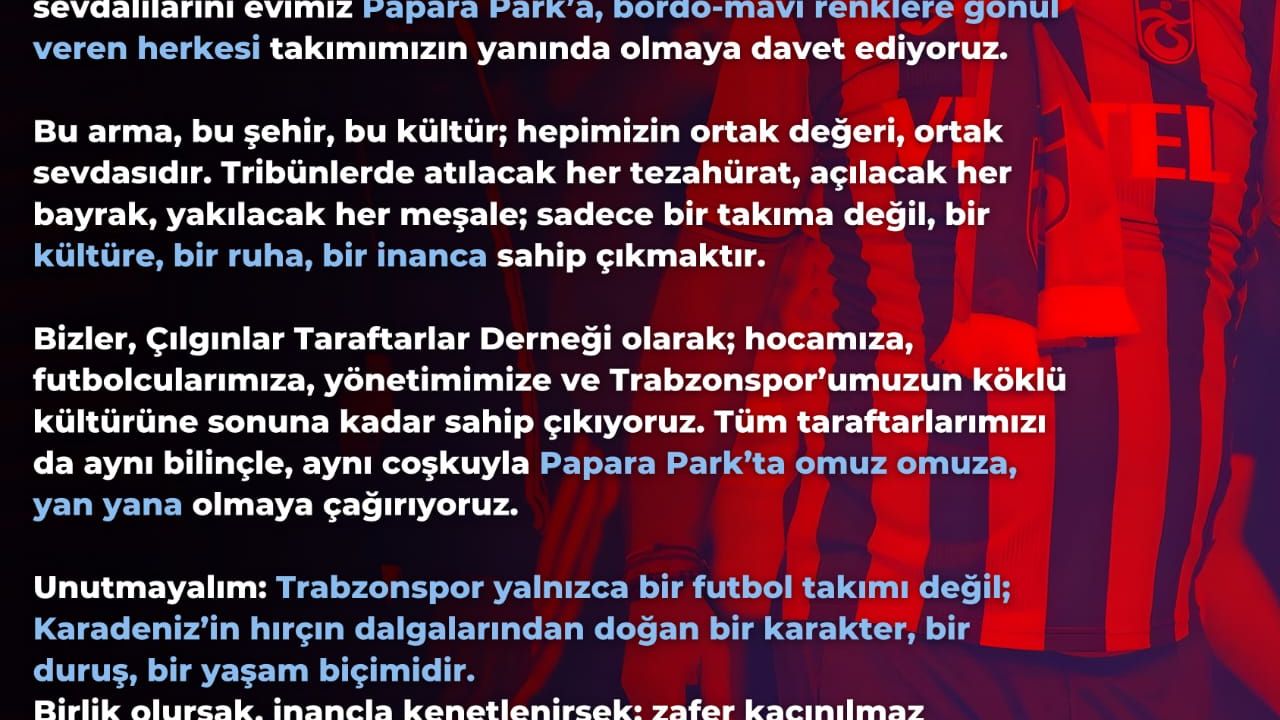 Çılgınlar Taraftarlar Derneği, açıklamasında birlik mesajını yineledi. “Hocalarımıza, futbolcularımıza, yönetimimize ve Trabzonspor’un köklü kültürüne sonuna kadar sahip çıkıyoruz” diyen Dernek Başkanı Tuncay Kara, tüm taraftar gruplarını aynı bilinç ve coşkuyla yan yana olmaya davet etti. Açıklamada ayrıca, “Trabzonspor yalnızca bir futbol takımı değil; Karadeniz’in hırçın dalgalarından doğan bir karakterdir, bir duruştur” ifadeleriyle kulübün manevi yönü ön plana çıkarıldı.