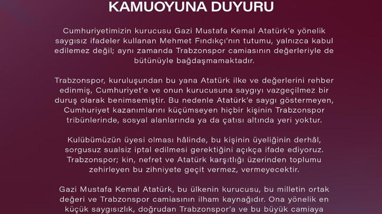 Vakfıkebir Trabzonsporlular Derneği’nin açıklamasında, Trabzonspor’un kuruluşundan bu yana Atatürk ilke ve değerlerini rehber edindiği vurgulandı. Cumhuriyet’e ve onun kurucusuna duyulan saygının, kulüp kültürünün vazgeçilmez bir parçası olduğu ifade edildi. Bu nedenle Atatürk’e saygı göstermeyen, Cumhuriyet kazanımlarını küçümseyen kişilerin Trabzonspor çatısı altında yer bulamayacağı açıkça belirtildi.