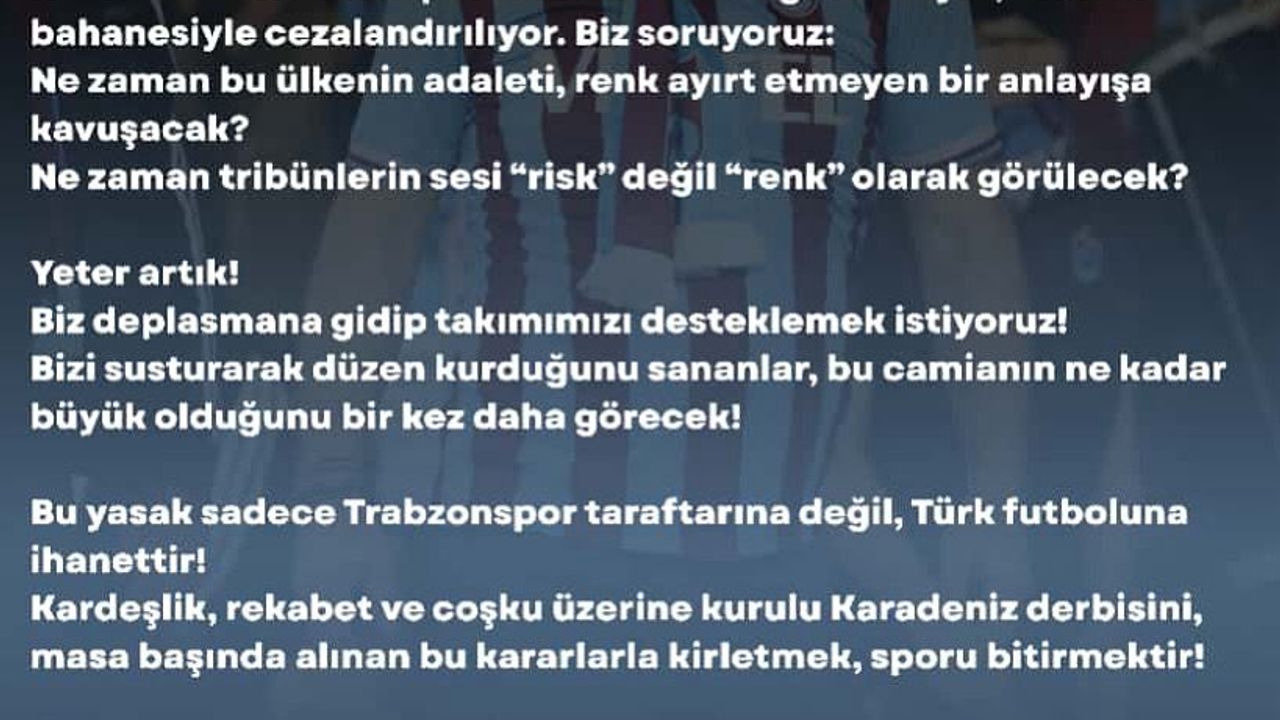 “Biz orada olmasak da, her statta yankılanacak bir sesimiz, her kalpte yanan bir ateşimiz var. Ne yasaklar bizi durdurabilir, ne susturmalar sevgimizi azaltabilir! Renklerimizi yasaklayamazsınız, sevdamızı engelleyemezsiniz, Trabzonspor taraftarı susturulamaz!”